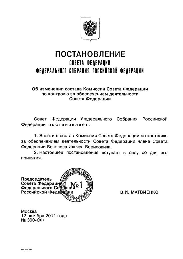 ПОСТАНОВЛЕНИЕ СФ ФС РФ от 12.10.2011 N 390-СФ
