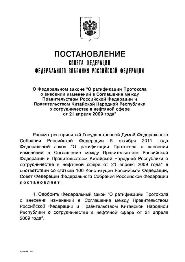 "О ФЕДЕРАЛЬНОМ ЗАКОНЕ "О РАТИФИКАЦИИ ПРОТОКОЛА О ВНЕСЕНИИ ИЗМЕНЕНИЙ В СОГЛАШЕНИЕ МЕЖДУ ПРАВИТЕЛЬСТВОМ РОССИЙСКОЙ ФЕДЕРАЦИИ И ПРАВИТЕЛЬСТВОМ КИТАЙСКОЙ НАРОДНОЙ РЕСПУБЛИКИ О СОТРУДНИЧЕСТВЕ В НЕФТЯНОЙ СФЕРЕ ОТ 21 АПРЕЛЯ 2009 ГОДА"