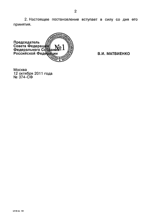ПОСТАНОВЛЕНИЕ СФ ФС РФ от 12.10.2011 N 374-СФ