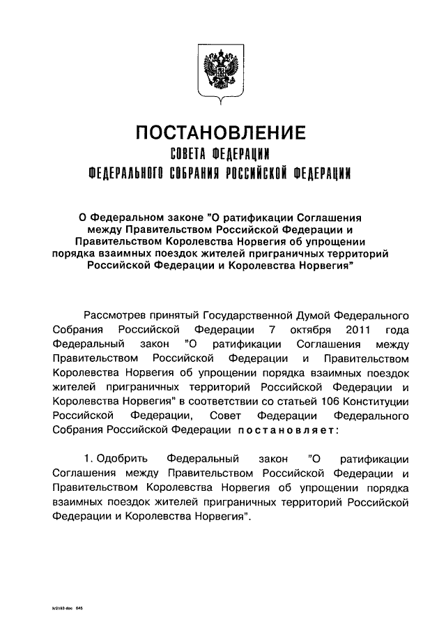 "О ФЕДЕРАЛЬНОМ ЗАКОНЕ "О РАТИФИКАЦИИ СОГЛАШЕНИЯ МЕЖДУ ПРАВИТЕЛЬСТВОМ РОССИЙСКОЙ ФЕДЕРАЦИИ И ПРАВИТЕЛЬСТВОМ КОРОЛЕВСТВА НОРВЕГИЯ ОБ УПРОЩЕНИИ ПОРЯДКА ВЗАИМНЫХ ПОЕЗДОК ЖИТЕЛЕЙ ПРИГРАНИЧНЫХ ТЕРРИТОРИЙ РОССИЙСКОЙ ФЕДЕРАЦИИ И КОРОЛЕВСТВА НОРВЕГИЯ"