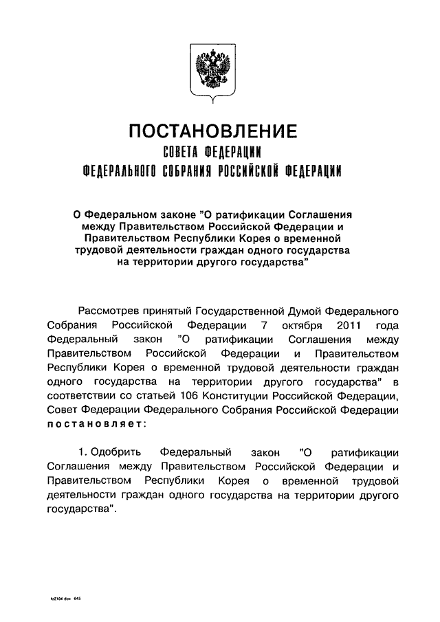 "О ФЕДЕРАЛЬНОМ ЗАКОНЕ "О РАТИФИКАЦИИ СОГЛАШЕНИЯ МЕЖДУ ПРАВИТЕЛЬСТВОМ РОССИЙСКОЙ ФЕДЕРАЦИИ И ПРАВИТЕЛЬСТВОМ РЕСПУБЛИКИ КОРЕЯ О ВРЕМЕННОЙ ТРУДОВОЙ ДЕЯТЕЛЬНОСТИ ГРАЖДАН ОДНОГО ГОСУДАРСТВА НА ТЕРРИТОРИИ ДРУГОГО ГОСУДАРСТВА"
