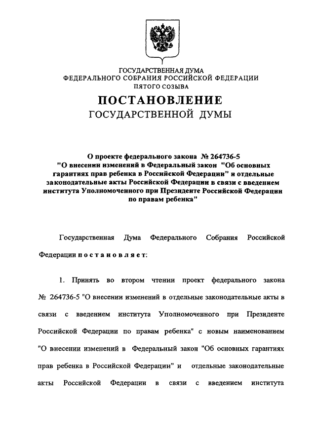 "О ПРОЕКТЕ ФЕДЕРАЛЬНОГО ЗАКОНА N 264736-5 "О ВНЕСЕНИИ ИЗМЕНЕНИЙ В ФЕДЕРАЛЬНЫЙ ЗАКОН "ОБ ОСНОВНЫХ ГАРАНТИЯХ ПРАВ РЕБЕНКА В РОССИЙСКОЙ ФЕДЕРАЦИИ" И ОТДЕЛЬНЫЕ ЗАКОНОДАТЕЛЬНЫЕ АКТЫ РОССИЙСКОЙ ФЕДЕРАЦИИ В СВЯЗИ С ВВЕДЕНИЕМ ИНСТИТУТА УПОЛНОМОЧЕННОГО ПРИ ПРЕЗИДЕНТЕ РОССИЙСКОЙ ФЕДЕРАЦИИ ПО ПРАВАМ РЕБЕНКА"