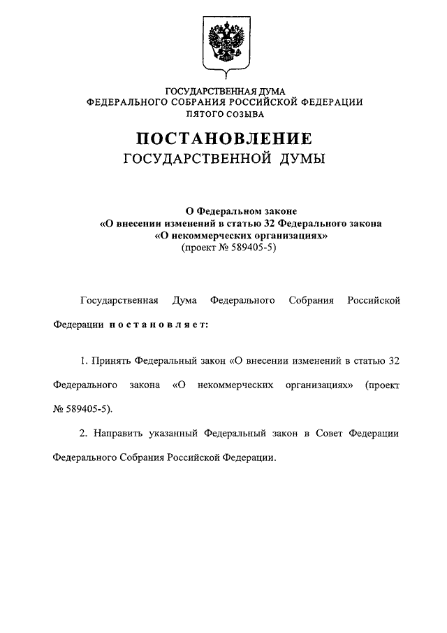 "О ФЕДЕРАЛЬНОМ ЗАКОНЕ "О ВНЕСЕНИИ ИЗМЕНЕНИЙ В СТАТЬЮ 32 ФЕДЕРАЛЬНОГО ЗАКОНА "О НЕКОММЕРЧЕСКИХ ОРГАНИЗАЦИЯХ" (ПРОЕКТ N 589405-5)"