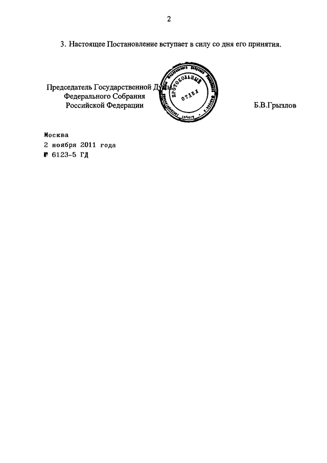 ПОСТАНОВЛЕНИЕ ГД ФС РФ от 02.11.2011 N 6123-5 ГД
