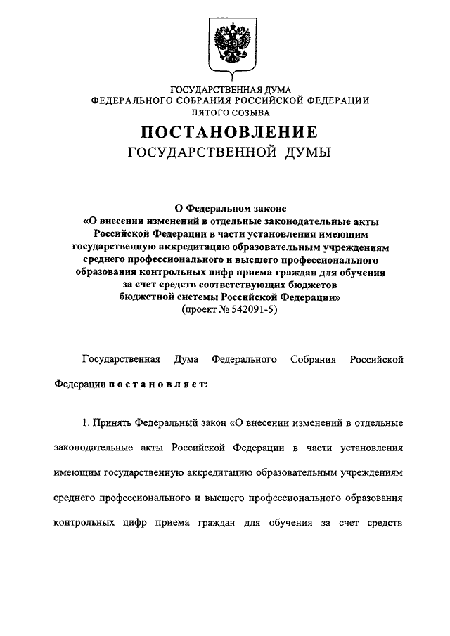 "О ФЕДЕРАЛЬНОМ ЗАКОНЕ "О ВНЕСЕНИИ ИЗМЕНЕНИЙ В ОТДЕЛЬНЫЕ ЗАКОНОДАТЕЛЬНЫЕ АКТЫ РОССИЙСКОЙ ФЕДЕРАЦИИ В ЧАСТИ УСТАНОВЛЕНИЯ ИМЕЮЩИМ ГОСУДАРСТВЕННУЮ АККРЕДИТАЦИЮ ОБРАЗОВАТЕЛЬНЫМ УЧРЕЖДЕНИЯМ СРЕДНЕГО ПРОФЕССИОНАЛЬНОГО И ВЫСШЕГО ПРОФЕССИОНАЛЬНОГО ОБРАЗОВАНИЯ КОНТРОЛЬНЫХ ЦИФР ПРИЕМА ГРАЖДАН ДЛЯ ОБУЧЕНИЯ ЗА СЧЕТ СРЕДСТВ СООТВЕТСТВУЮЩИХ БЮДЖЕТОВ БЮДЖЕТНОЙ СИСТЕМЫ РОССИЙСКОЙ ФЕДЕРАЦИИ" (ПРОЕКТ N 542091-5)"