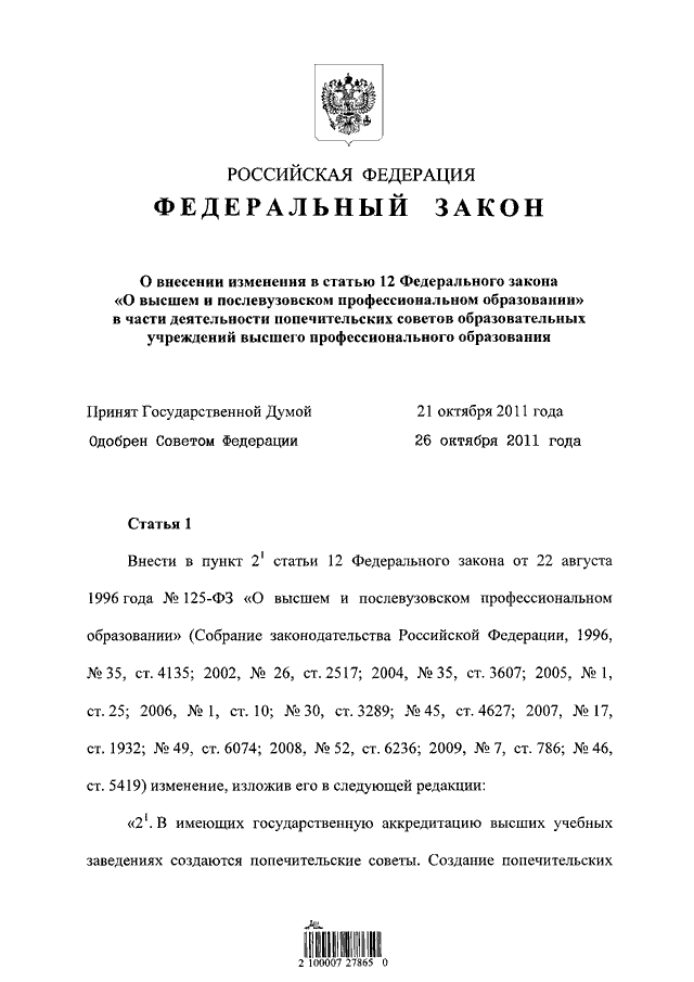 "О ВНЕСЕНИИ ИЗМЕНЕНИЯ В СТАТЬЮ 12 ФЕДЕРАЛЬНОГО ЗАКОНА "О ВЫСШЕМ И ПОСЛЕВУЗОВСКОМ ПРОФЕССИОНАЛЬНОМ ОБРАЗОВАНИИ" В ЧАСТИ ДЕЯТЕЛЬНОСТИ ПОПЕЧИТЕЛЬСКИХ СОВЕТОВ ОБРАЗОВАТЕЛЬНЫХ УЧРЕЖДЕНИЙ ВЫСШЕГО ПРОФЕССИОНАЛЬНОГО ОБРАЗОВАНИЯ"