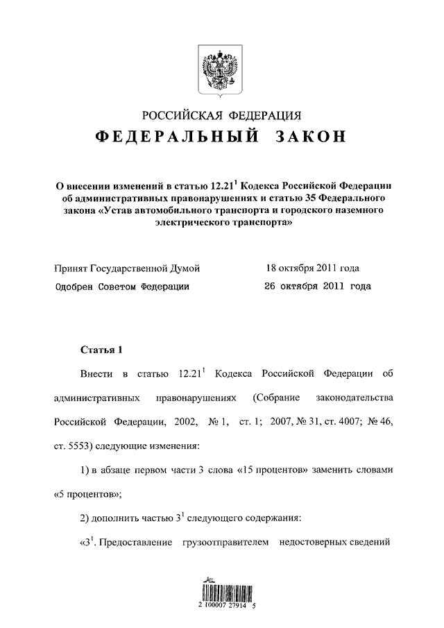 "О ВНЕСЕНИИ ИЗМЕНЕНИЙ В СТАТЬЮ 12.21.1 КОДЕКСА РОССИЙСКОЙ