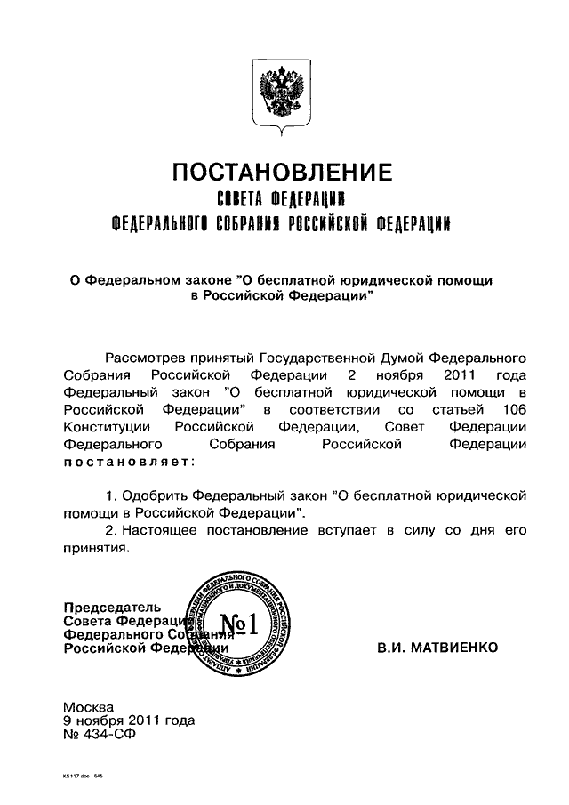 ПОСТАНОВЛЕНИЕ СФ ФС РФ от 09.11.2011 N 434-СФ