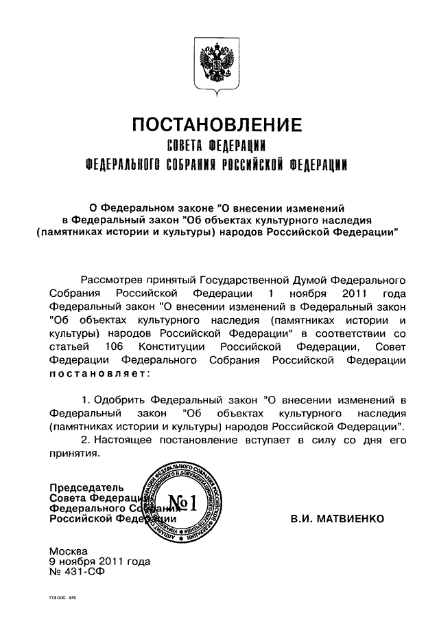 ПОСТАНОВЛЕНИЕ СФ ФС РФ от 09.11.2011 N 431-СФ