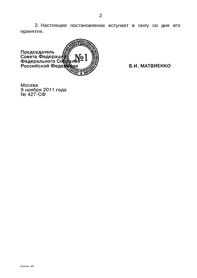 ПОСТАНОВЛЕНИЕ СФ ФС РФ от 09.11.2011 N 427-СФ
