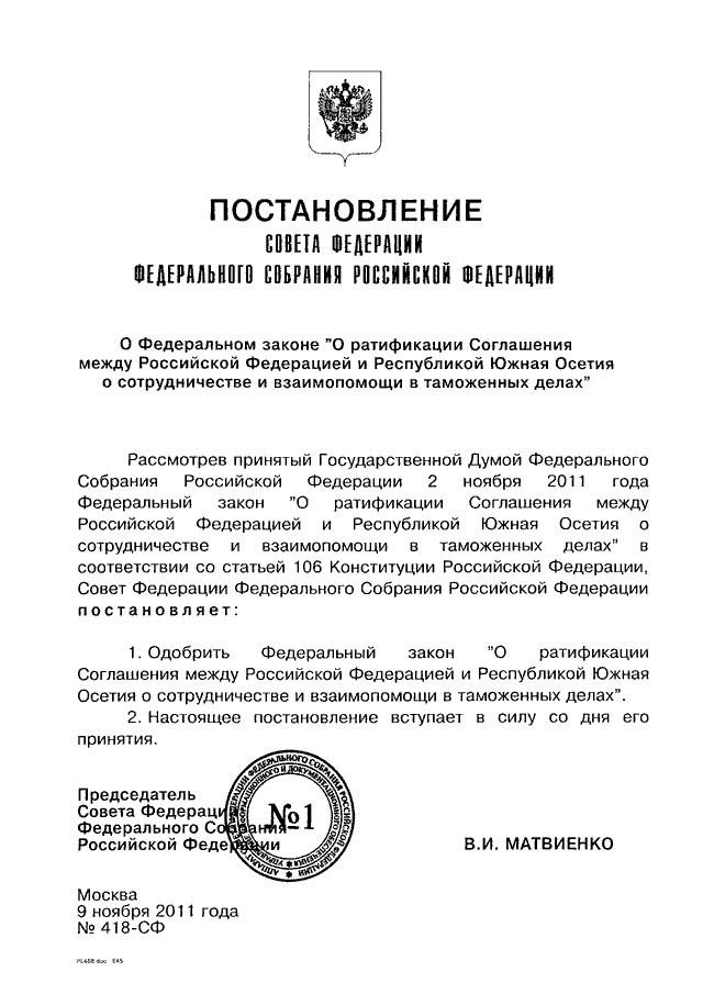 ПОСТАНОВЛЕНИЕ СФ ФС РФ от 09.11.2011 N 418-СФ