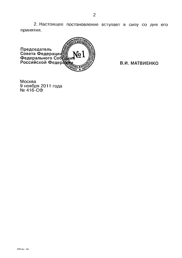 ПОСТАНОВЛЕНИЕ СФ ФС РФ от 09.11.2011 N 416-СФ