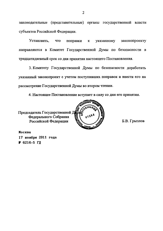 ПОСТАНОВЛЕНИЕ ГД ФС РФ от 17.11.2011 N 6216-5 ГД