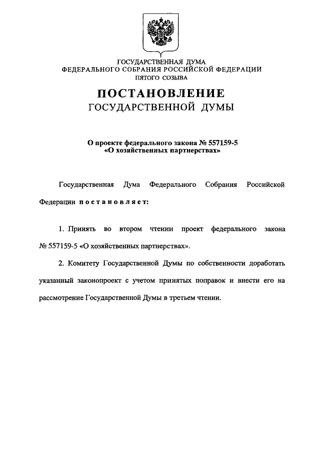 "О ПРОЕКТЕ ФЕДЕРАЛЬНОГО ЗАКОНА N 557159-5 "О ХОЗЯЙСТВЕННЫХ ПАРТНЕРСТВАХ"
