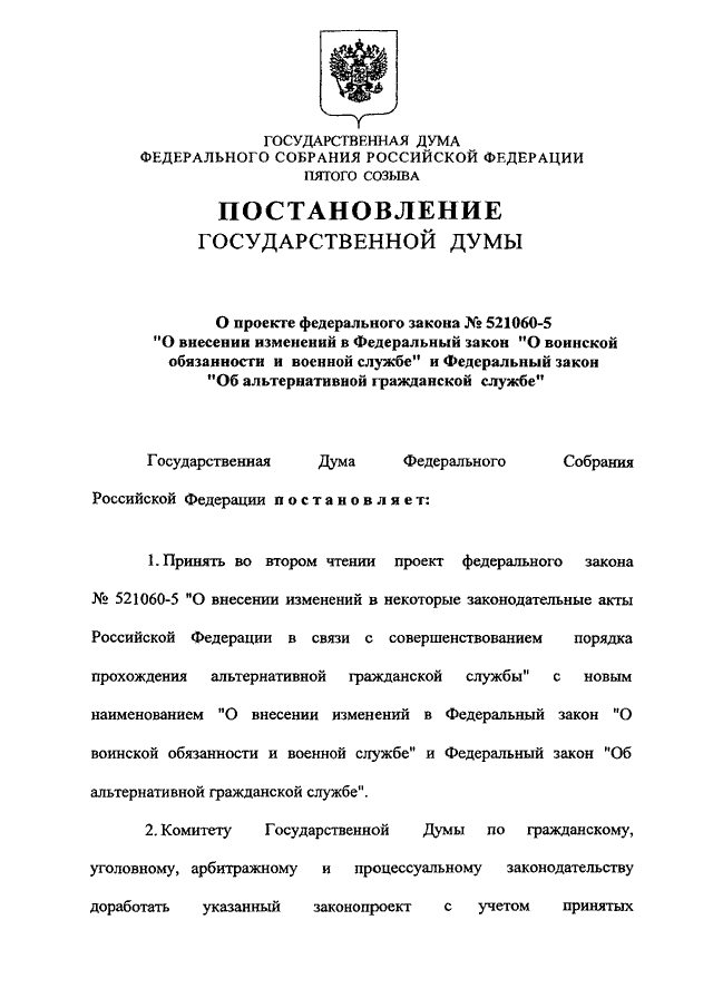 "О ПРОЕКТЕ ФЕДЕРАЛЬНОГО ЗАКОНА N 521060-5 "О ВНЕСЕНИИ ИЗМЕНЕНИЙ В ФЕДЕРАЛЬНЫЙ ЗАКОН "О ВОИНСКОЙ ОБЯЗАННОСТИ И ВОЕННОЙ СЛУЖБЕ" И ФЕДЕРАЛЬНЫЙ ЗАКОН "ОБ АЛЬТЕРНАТИВНОЙ ГРАЖДАНСКОЙ СЛУЖБЕ"