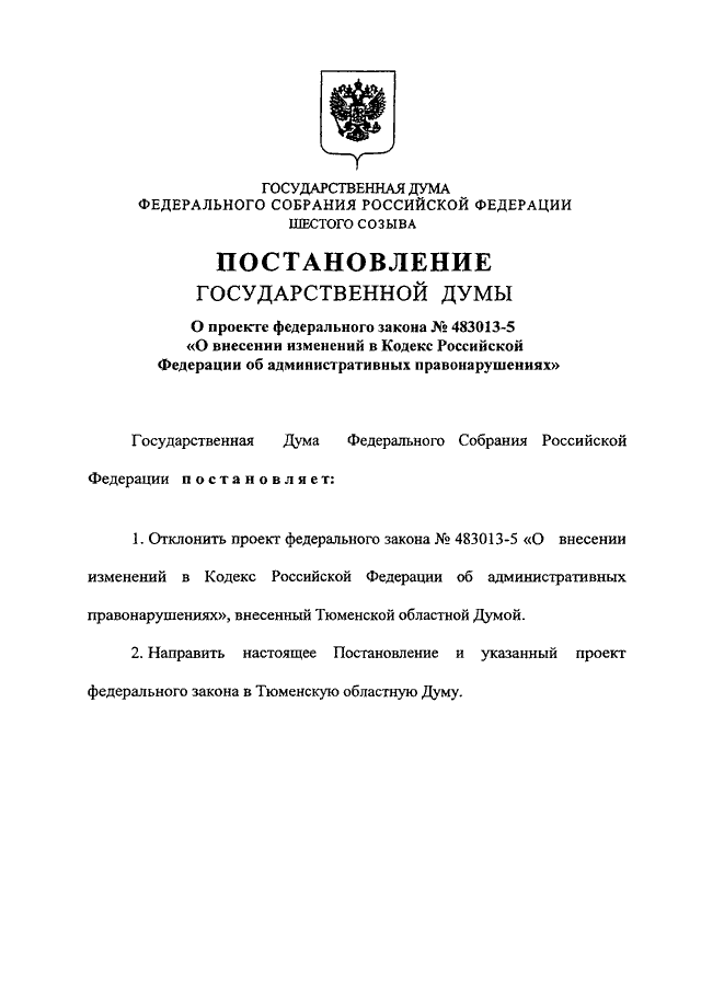 "О ПРОЕКТЕ ФЕДЕРАЛЬНОГО ЗАКОНА N 483013-5 "О ВНЕСЕНИИ ИЗМЕНЕНИЙ В КОДЕКС РОССИЙСКОЙ ФЕДЕРАЦИИ ОБ АДМИНИСТРАТИВНЫХ ПРАВОНАРУШЕНИЯХ"