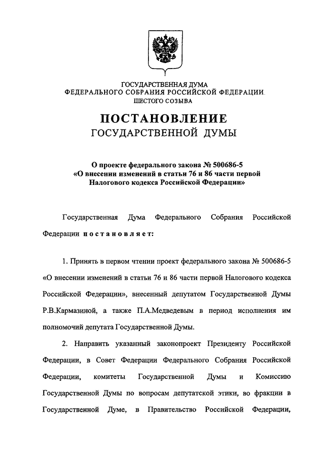 "О ПРОЕКТЕ ФЕДЕРАЛЬНОГО ЗАКОНА N 500686-5 "О ВНЕСЕНИИ ИЗМЕНЕНИЙ В СТАТЬИ 76 И 86 ЧАСТИ ПЕРВОЙ НАЛОГОВОГО КОДЕКСА РОССИЙСКОЙ ФЕДЕРАЦИИ"