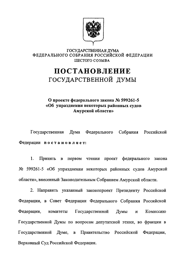 "О ПРОЕКТЕ ФЕДЕРАЛЬНОГО ЗАКОНА N 599261-5 "ОБ УПРАЗДНЕНИИ НЕКОТОРЫХ РАЙОННЫХ СУДОВ АМУРСКОЙ ОБЛАСТИ"