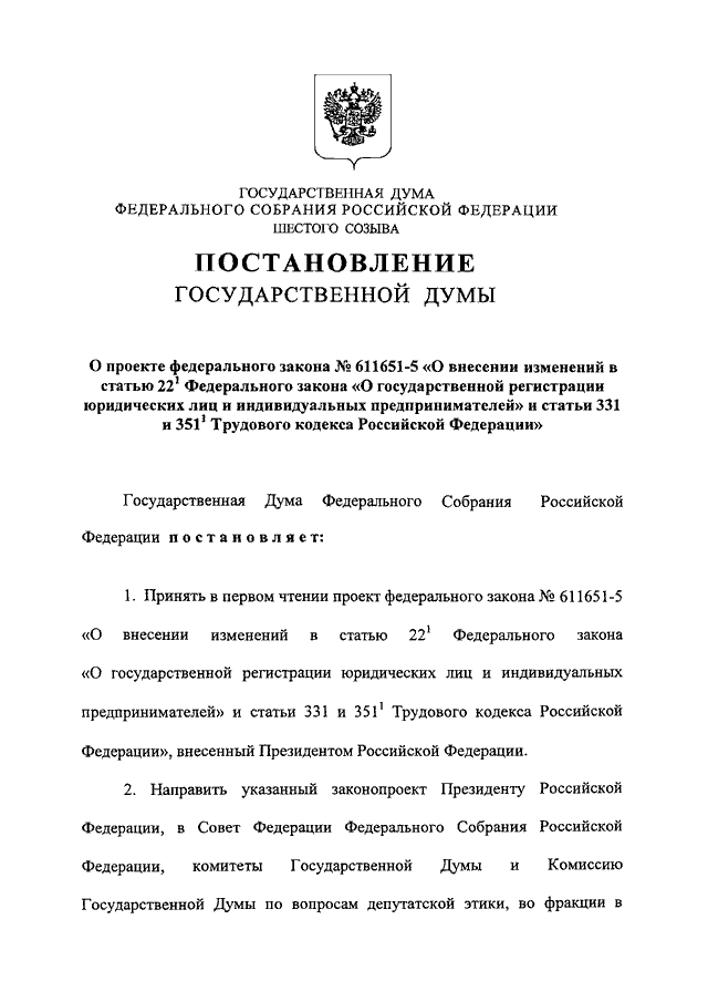 "О ПРОЕКТЕ ФЕДЕРАЛЬНОГО ЗАКОНА N 611651-5 "О ВНЕСЕНИИ ИЗМЕНЕНИЙ