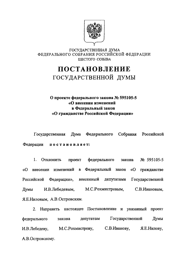 "О ПРОЕКТЕ ФЕДЕРАЛЬНОГО ЗАКОНА N 595105-5 "О ВНЕСЕНИИ ИЗМЕНЕНИЙ В ФЕДЕРАЛЬНЫЙ ЗАКОН "О ГРАЖДАНСТВЕ РОССИЙСКОЙ ФЕДЕРАЦИИ"