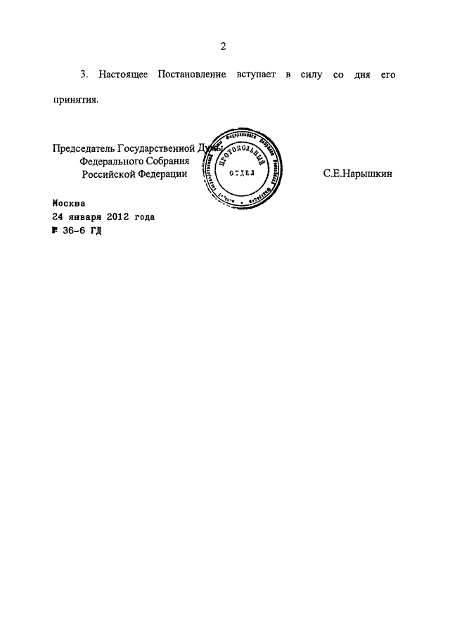 ПОСТАНОВЛЕНИЕ ГД ФС РФ от 24.01.2012 N 36-6 ГД