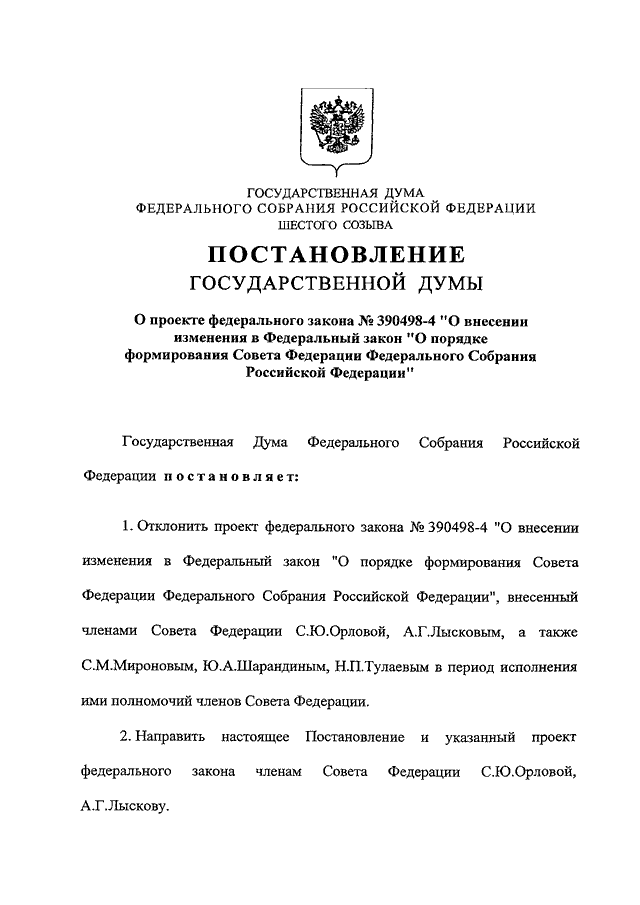 "О ПРОЕКТЕ ФЕДЕРАЛЬНОГО ЗАКОНА N 390498-4 "О ВНЕСЕНИИ ИЗМЕНЕНИЯ В ФЕДЕРАЛЬНЫЙ ЗАКОН "О ПОРЯДКЕ ФОРМИРОВАНИЯ СОВЕТА ФЕДЕРАЦИИ ФЕДЕРАЛЬНОГО СОБРАНИЯ РОССИЙСКОЙ ФЕДЕРАЦИИ"
