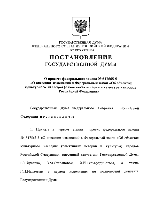 "О ПРОЕКТЕ ФЕДЕРАЛЬНОГО ЗАКОНА N 617565-5 "О ВНЕСЕНИИ ИЗМЕНЕНИЙ В ФЕДЕРАЛЬНЫЙ ЗАКОН "ОБ ОБЪЕКТАХ КУЛЬТУРНОГО НАСЛЕДИЯ (ПАМЯТНИКАХ ИСТОРИИ И КУЛЬТУРЫ) НАРОДОВ РОССИЙСКОЙ ФЕДЕРАЦИИ"