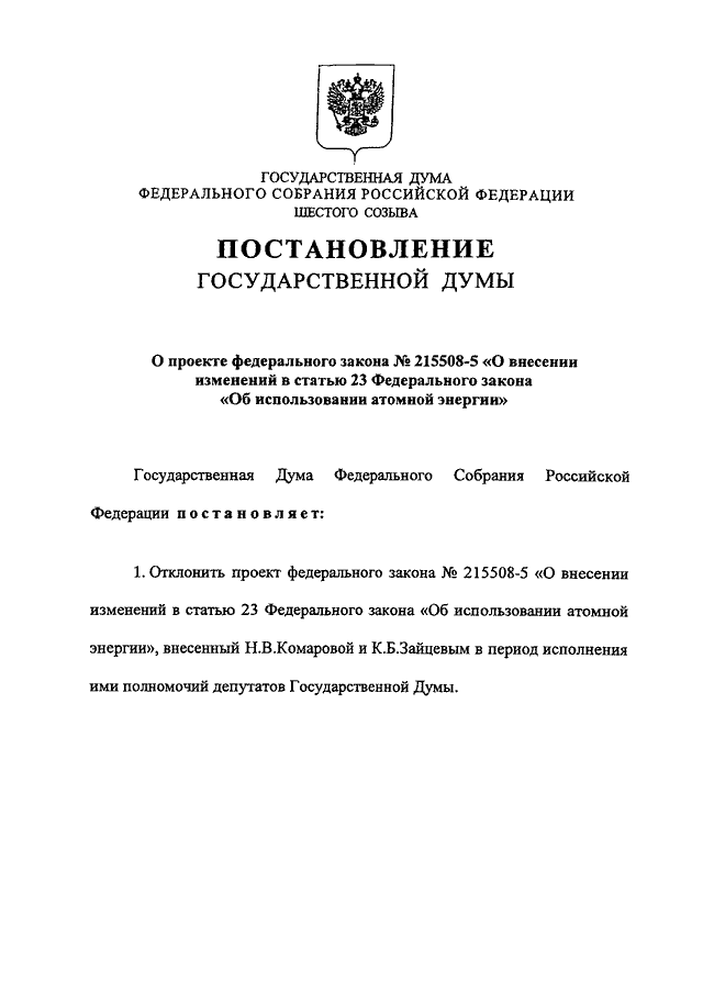 "О ПРОЕКТЕ ФЕДЕРАЛЬНОГО ЗАКОНА N 215508-5 "О ВНЕСЕНИИ ИЗМЕНЕНИЙ В СТАТЬЮ 23 ФЕДЕРАЛЬНОГО ЗАКОНА "ОБ ИСПОЛЬЗОВАНИИ АТОМНОЙ ЭНЕРГИИ"
