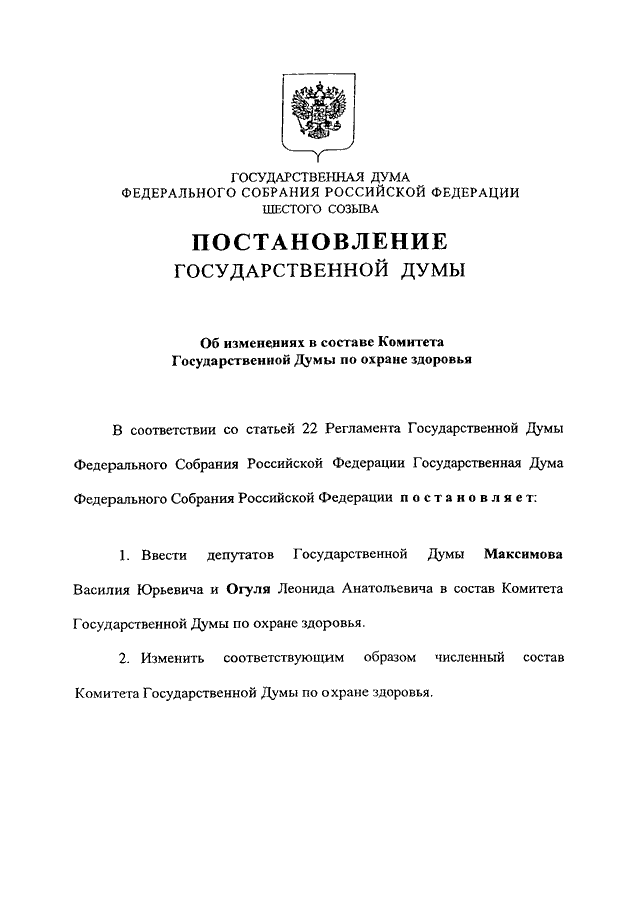 "ОБ ИЗМЕНЕНИЯХ В СОСТАВЕ КОМИТЕТА ГОСУДАРСТВЕННОЙ ДУМЫ ПО ОХРАНЕ ЗДОРОВЬЯ"