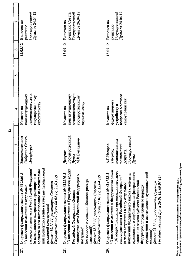 "О КАЛЕНДАРЕ РАССМОТРЕНИЯ ВОПРОСОВ ГОСУДАРСТВЕННОЙ ДУМОЙ С 15 ПО 25 МАЯ 2012 ГОДА"