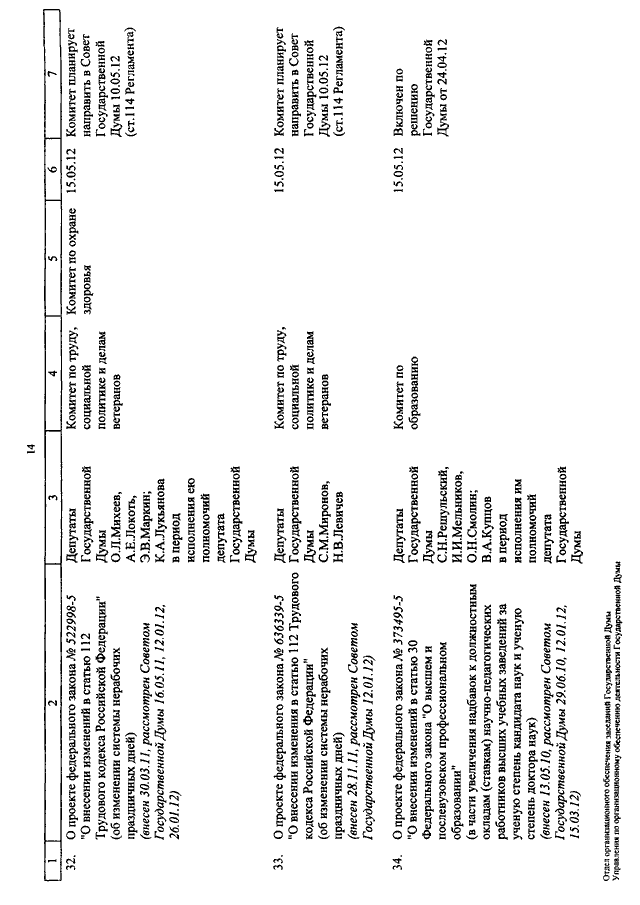 "О КАЛЕНДАРЕ РАССМОТРЕНИЯ ВОПРОСОВ ГОСУДАРСТВЕННОЙ ДУМОЙ С 15 ПО 25 МАЯ 2012 ГОДА"