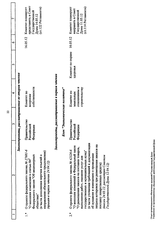 "О КАЛЕНДАРЕ РАССМОТРЕНИЯ ВОПРОСОВ ГОСУДАРСТВЕННОЙ ДУМОЙ С 15 ПО 25 МАЯ 2012 ГОДА"