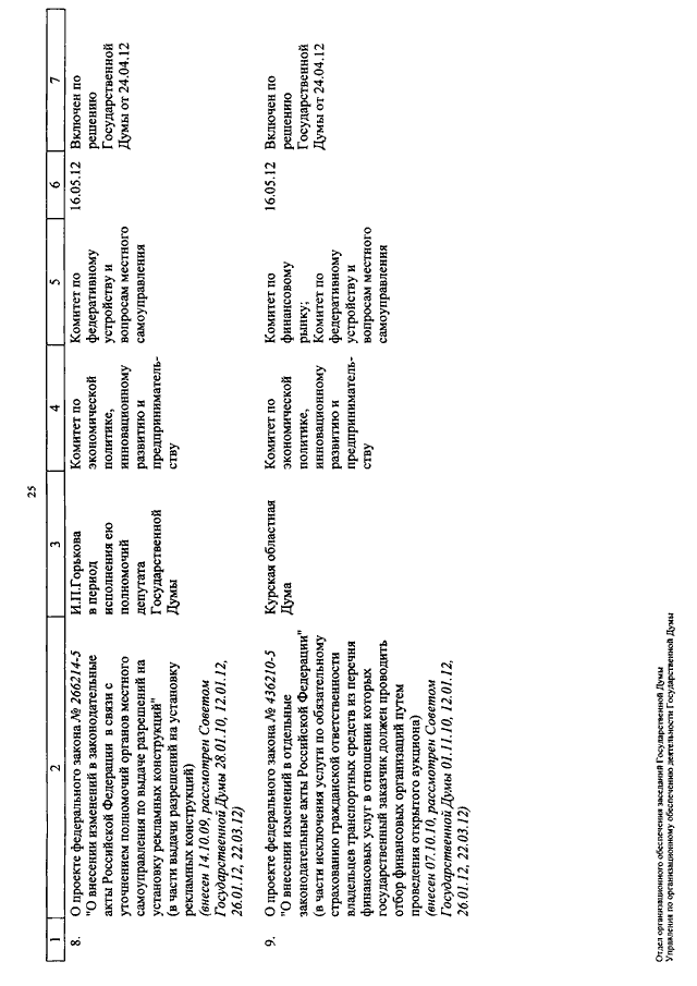 "О КАЛЕНДАРЕ РАССМОТРЕНИЯ ВОПРОСОВ ГОСУДАРСТВЕННОЙ ДУМОЙ С 15 ПО 25 МАЯ 2012 ГОДА"