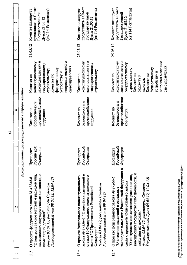 "О КАЛЕНДАРЕ РАССМОТРЕНИЯ ВОПРОСОВ ГОСУДАРСТВЕННОЙ ДУМОЙ С 15 ПО 25 МАЯ 2012 ГОДА"