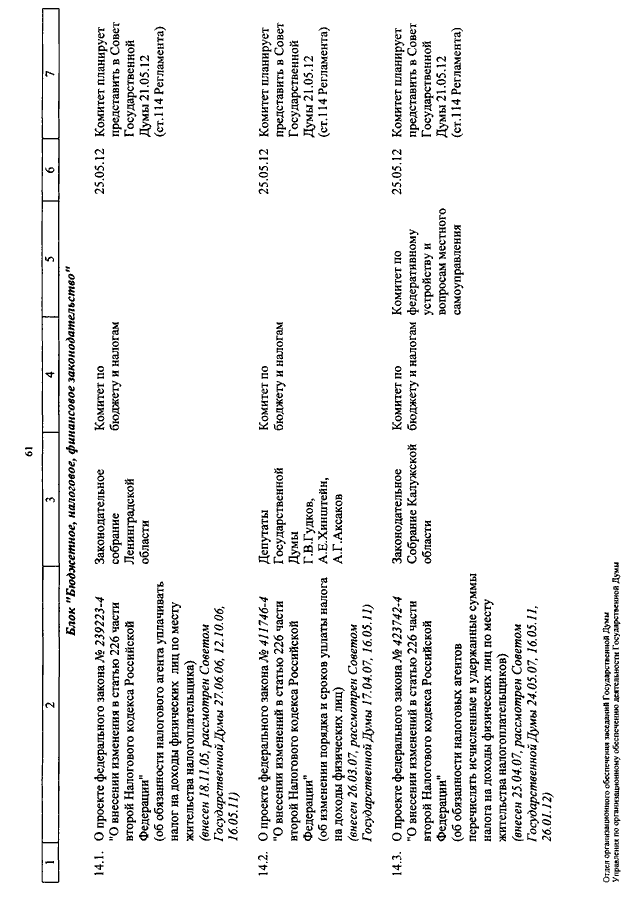 "О КАЛЕНДАРЕ РАССМОТРЕНИЯ ВОПРОСОВ ГОСУДАРСТВЕННОЙ ДУМОЙ С 15 ПО 25 МАЯ 2012 ГОДА"