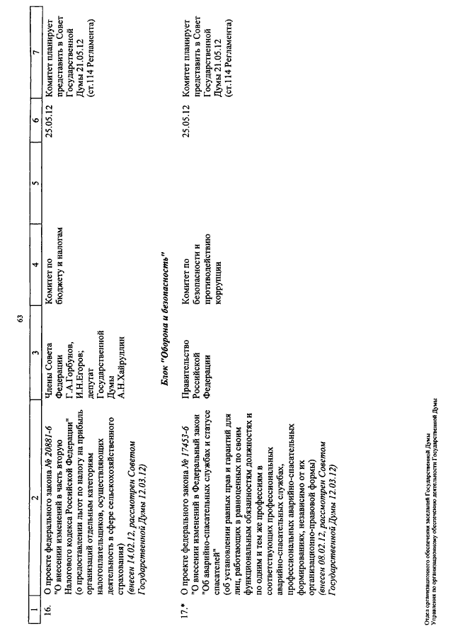 "О КАЛЕНДАРЕ РАССМОТРЕНИЯ ВОПРОСОВ ГОСУДАРСТВЕННОЙ ДУМОЙ С 15 ПО 25 МАЯ 2012 ГОДА"