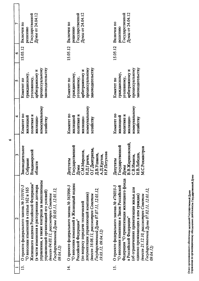 "О КАЛЕНДАРЕ РАССМОТРЕНИЯ ВОПРОСОВ ГОСУДАРСТВЕННОЙ ДУМОЙ С 15 ПО 25 МАЯ 2012 ГОДА"