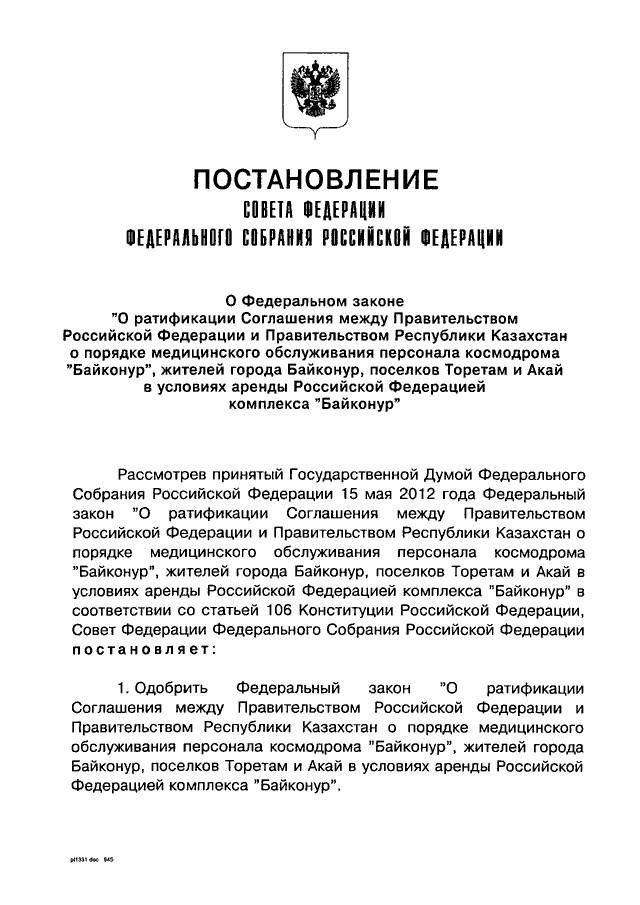"О ФЕДЕРАЛЬНОМ ЗАКОНЕ "О РАТИФИКАЦИИ СОГЛАШЕНИЯ МЕЖДУ ПРАВИТЕЛЬСТВОМ РОССИЙСКОЙ ФЕДЕРАЦИИ И ПРАВИТЕЛЬСТВОМ РЕСПУБЛИКИ КАЗАХСТАН О ПОРЯДКЕ МЕДИЦИНСКОГО ОБСЛУЖИВАНИЯ ПЕРСОНАЛА КОСМОДРОМА "БАЙКОНУР", ЖИТЕЛЕЙ ГОРОДА БАЙКОНУР, ПОСЕЛКОВ ТОРЕТАМ И АКАЙ В УСЛОВИЯХ АРЕНДЫ РОССИЙСКОЙ ФЕДЕРАЦИЕЙ КОМПЛЕКСА "БАЙКОНУР"