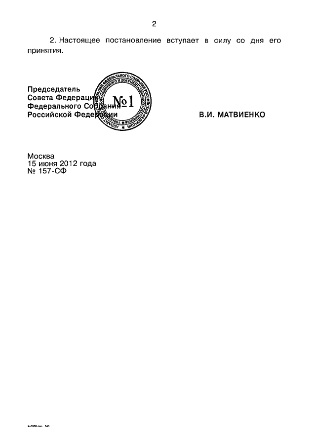 ПОСТАНОВЛЕНИЕ СФ ФС РФ от 15.06.2012 N 157-СФ