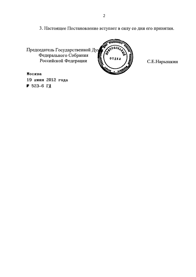 ПОСТАНОВЛЕНИЕ ГД ФС РФ от 19.06.2012 N 523-6 ГД