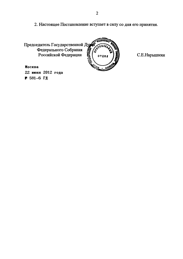 ПОСТАНОВЛЕНИЕ ГД ФС РФ от 22.06.2012 N 581-6 ГД