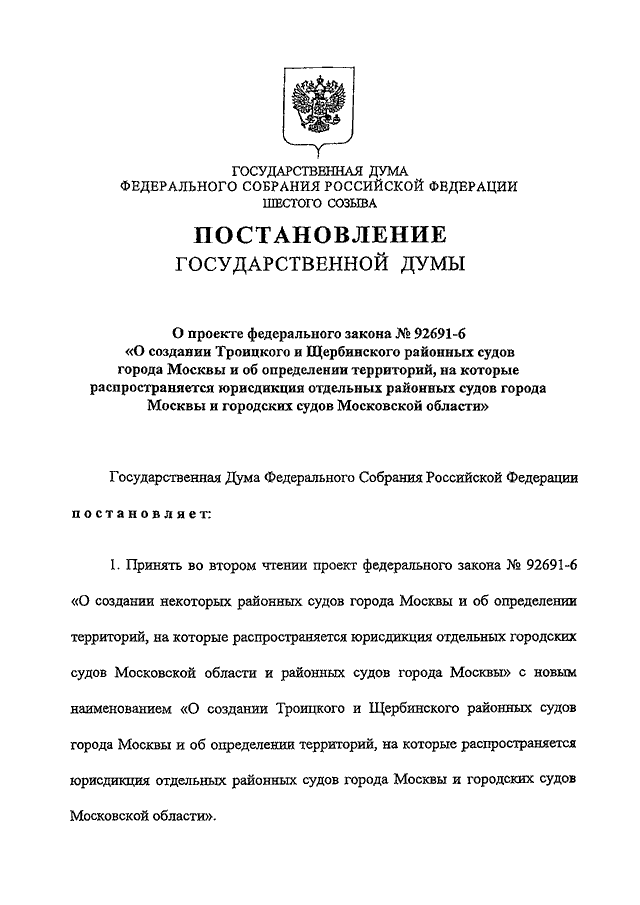 "О ПРОЕКТЕ ФЕДЕРАЛЬНОГО ЗАКОНА N 92691-6 "О СОЗДАНИИ ТРОИЦКОГО И