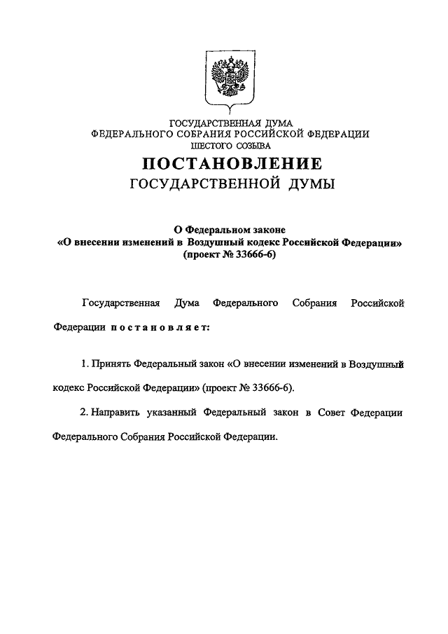 "О ФЕДЕРАЛЬНОМ ЗАКОНЕ "О ВНЕСЕНИИ ИЗМЕНЕНИЙ В ВОЗДУШНЫЙ КОДЕКС РОССИЙСКОЙ ФЕДЕРАЦИИ" (ПРОЕКТ N 33666-6)"