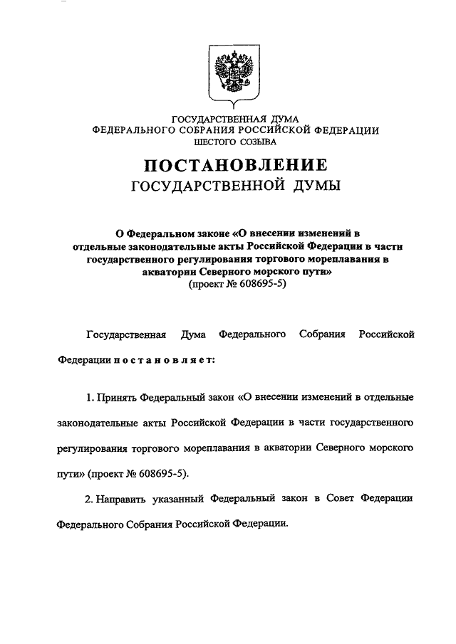 "О ФЕДЕРАЛЬНОМ ЗАКОНЕ "О ВНЕСЕНИИ ИЗМЕНЕНИЙ В ОТДЕЛЬНЫЕ ЗАКОНОДАТЕЛЬНЫЕ АКТЫ РОССИЙСКОЙ ФЕДЕРАЦИИ В ЧАСТИ ГОСУДАРСТВЕННОГО РЕГУЛИРОВАНИЯ ТОРГОВОГО МОРЕПЛАВАНИЯ В АКВАТОРИИ СЕВЕРНОГО МОРСКОГО ПУТИ" (ПРОЕКТ N 608695-5)"