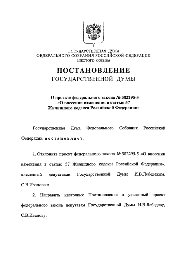 "О ПРОЕКТЕ ФЕДЕРАЛЬНОГО ЗАКОНА N 582295-5 "О ВНЕСЕНИИ ИЗМЕНЕНИЯ В СТАТЬЮ 57 ЖИЛИЩНОГО КОДЕКСА РОССИЙСКОЙ ФЕДЕРАЦИИ"