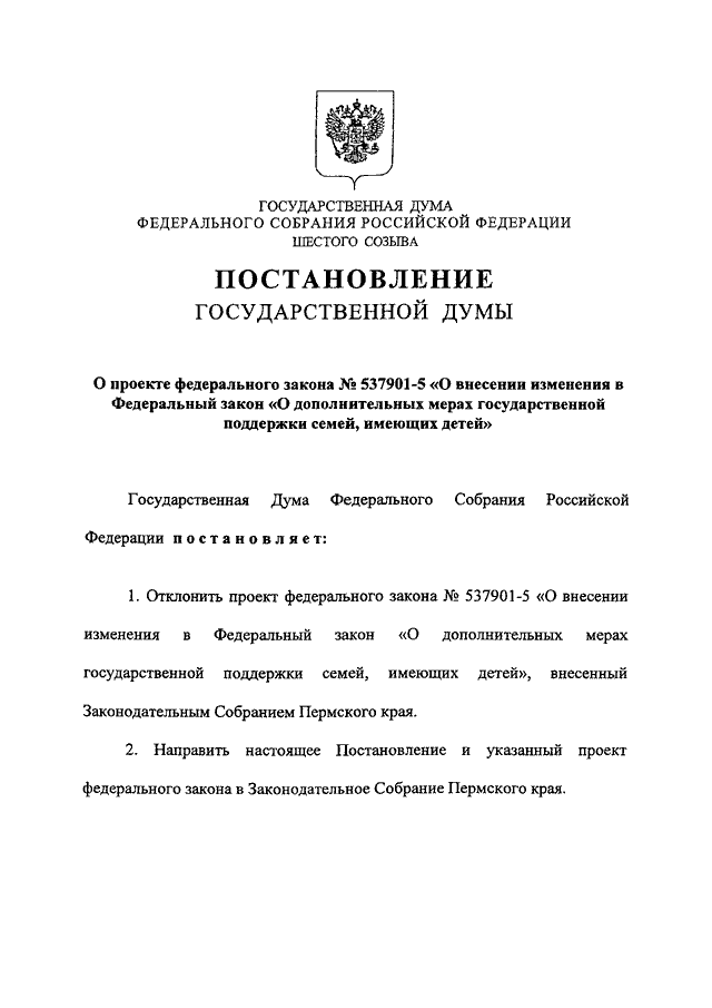 "О ПРОЕКТЕ ФЕДЕРАЛЬНОГО ЗАКОНА N 537901-5 "О ВНЕСЕНИИ ИЗМЕНЕНИЯ В ФЕДЕРАЛЬНЫЙ ЗАКОН "О ДОПОЛНИТЕЛЬНЫХ МЕРАХ ГОСУДАРСТВЕННОЙ ПОДДЕРЖКИ СЕМЕЙ, ИМЕЮЩИХ ДЕТЕЙ"