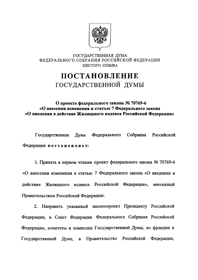"О ПРОЕКТЕ ФЕДЕРАЛЬНОГО ЗАКОНА N 70769-6 "О ВНЕСЕНИИ ИЗМЕНЕНИЯ В СТАТЬЮ 7 ФЕДЕРАЛЬНОГО ЗАКОНА "О ВВЕДЕНИИ В ДЕЙСТВИЕ ЖИЛИЩНОГО КОДЕКСА РОССИЙСКОЙ ФЕДЕРАЦИИ"
