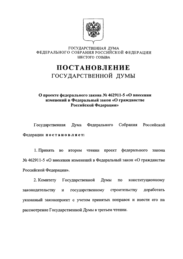 "О ПРОЕКТЕ ФЕДЕРАЛЬНОГО ЗАКОНА N 462911-5 "О ВНЕСЕНИИ ИЗМЕНЕНИЙ В ФЕДЕРАЛЬНЫЙ ЗАКОН "О ГРАЖДАНСТВЕ РОССИЙСКОЙ ФЕДЕРАЦИИ"