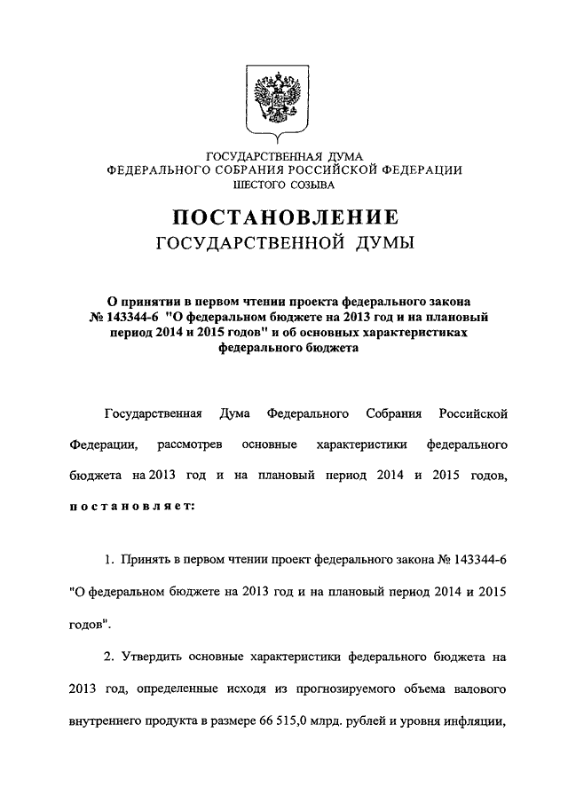 "О ПРИНЯТИИ В ПЕРВОМ ЧТЕНИИ ПРОЕКТА ФЕДЕРАЛЬНОГО ЗАКОНА N 143344-6 "О ФЕДЕРАЛЬНОМ БЮДЖЕТЕ НА 2013 ГОД И НА ПЛАНОВЫЙ ПЕРИОД 2014 И 2015 ГОДОВ" И ОБ ОСНОВНЫХ ХАРАКТЕРИСТИКАХ ФЕДЕРАЛЬНОГО БЮДЖЕТА"