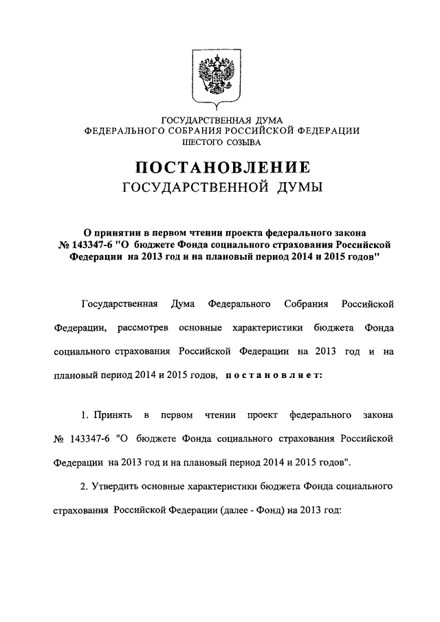 "О ПРИНЯТИИ В ПЕРВОМ ЧТЕНИИ ПРОЕКТА ФЕДЕРАЛЬНОГО ЗАКОНА N 143347-6 "О БЮДЖЕТЕ ФОНДА СОЦИАЛЬНОГО СТРАХОВАНИЯ РОССИЙСКОЙ ФЕДЕРАЦИИ НА 2013 ГОД И НА ПЛАНОВЫЙ ПЕРИОД 2014 И 2015 ГОДОВ"
